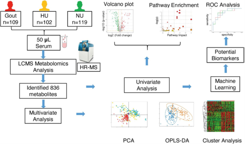 圖1. TripleTOF 6600利用基于高分辨質譜的代謝組學技術與機器學習方法系統揭示了痛風和高尿酸血癥中顯著改變的代謝通路,成功篩選到了13種潛在的代謝物,用以區分無癥狀高尿酸血癥和痛風患者。